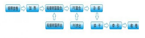 工藝主要步驟:鋼帶放卷--加熱--粘接樹脂復(fù)合--PE復(fù)合--冷卻--烘干--牽引--收卷。